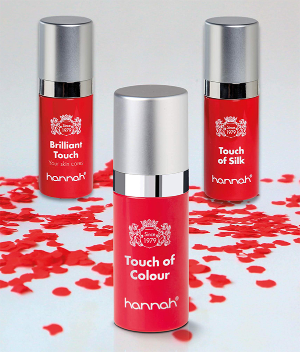 Na het ongekende succes van de producten Touch of Silk (Beauty Press Innovation Award) en de Brilliant Touch (Beauty Astir & Marie Claire Prix d’Excellence de la Beauté) voegt hannah met Touch of Colour een nieuwe kleurrijke telg toe aan de populaire ‘Touch-familie’. Hiermee krijgen elk denkbaar huidtype én een groot palet aan huidtinten een stralend vleugje kleur en direct een optisch egale en gave huid.